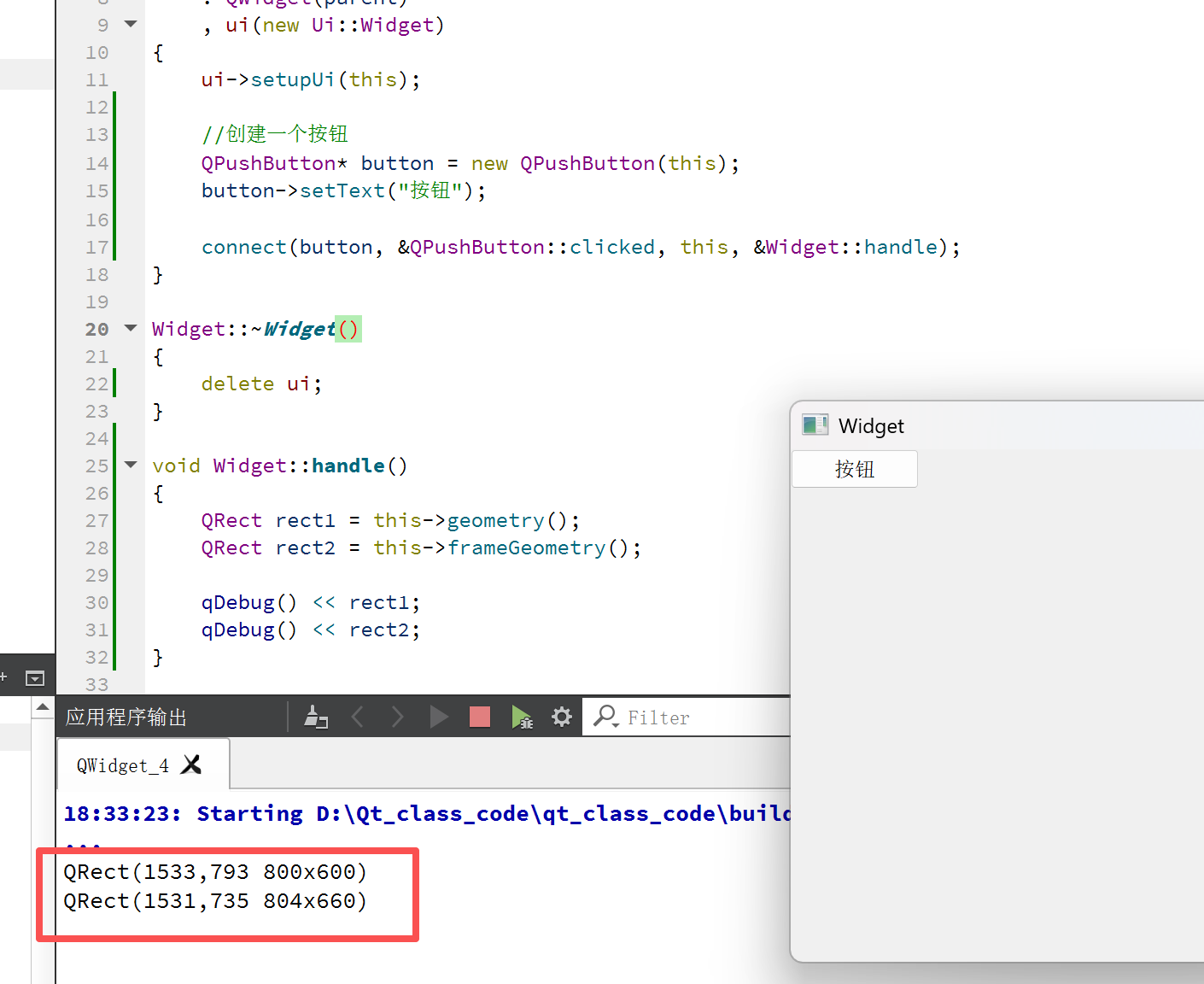| geometry() | 获取控件的位置和尺寸信息。返回结果为QRect对象,包含x坐标、y坐标、宽度和高度值。其中x和y表示控件左上角的坐标位置。 |