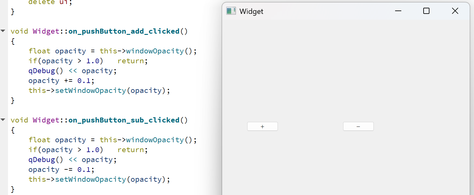 上述代码中,在进行设置之前,先判定了opacity的范围,然后再决定是否要设置,这个判断其实可以不写。超过1.0的数字设置不进去,因为setWindowOpacity内部也进行了判定。
