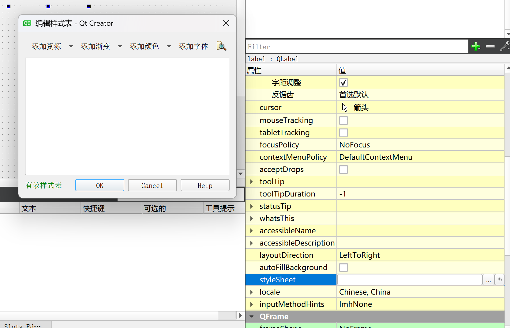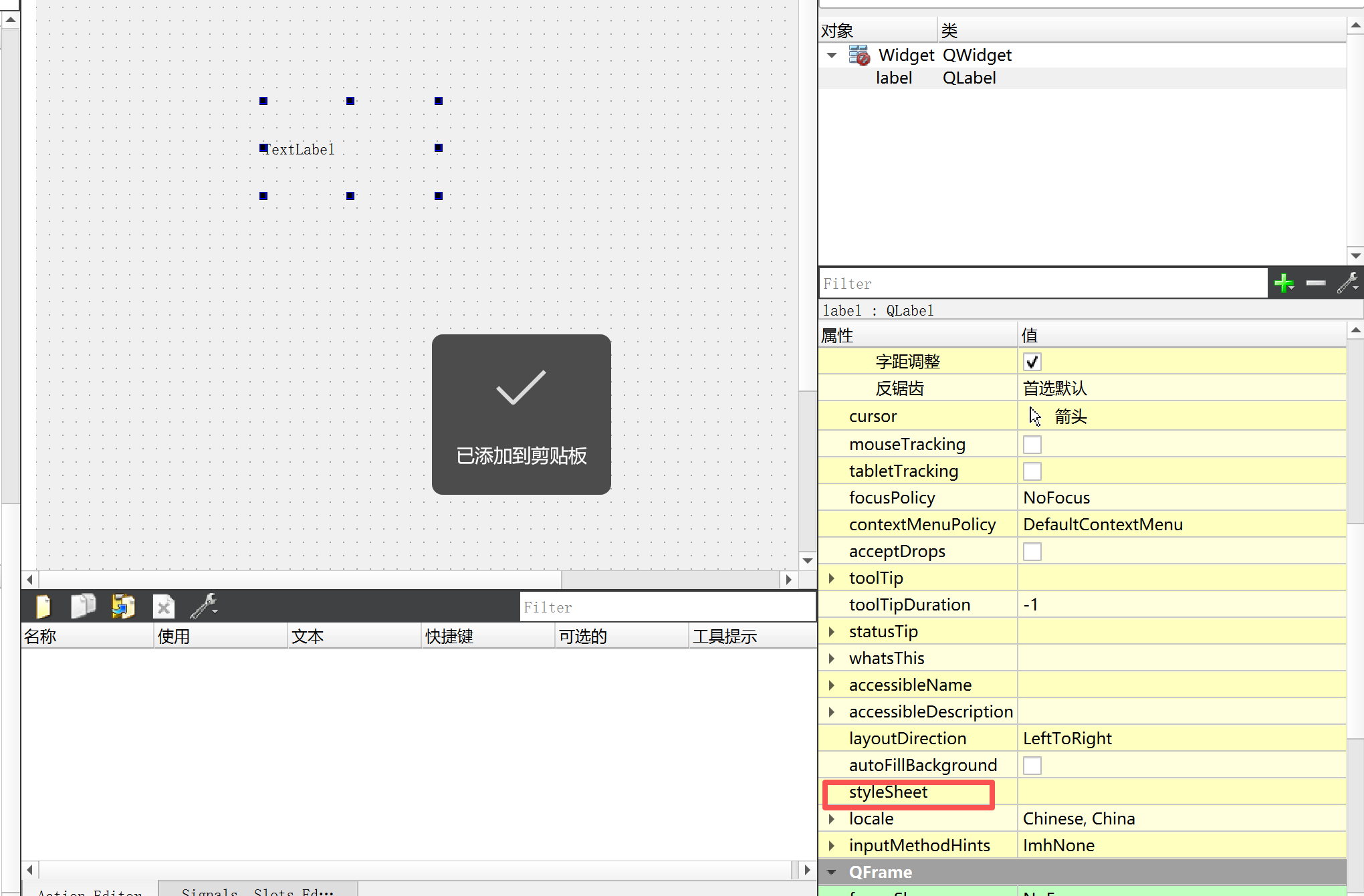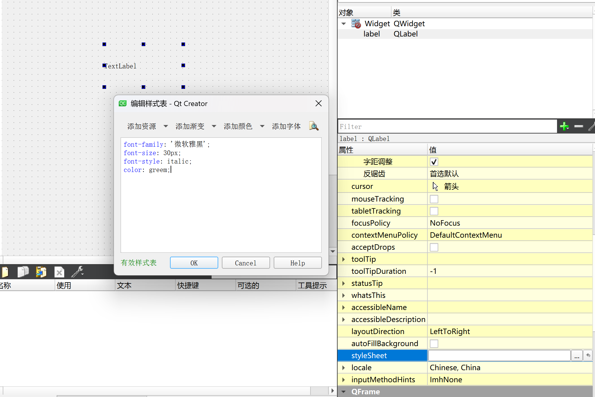 创建一个label(在右侧我们可以看到styleSheet的设置):