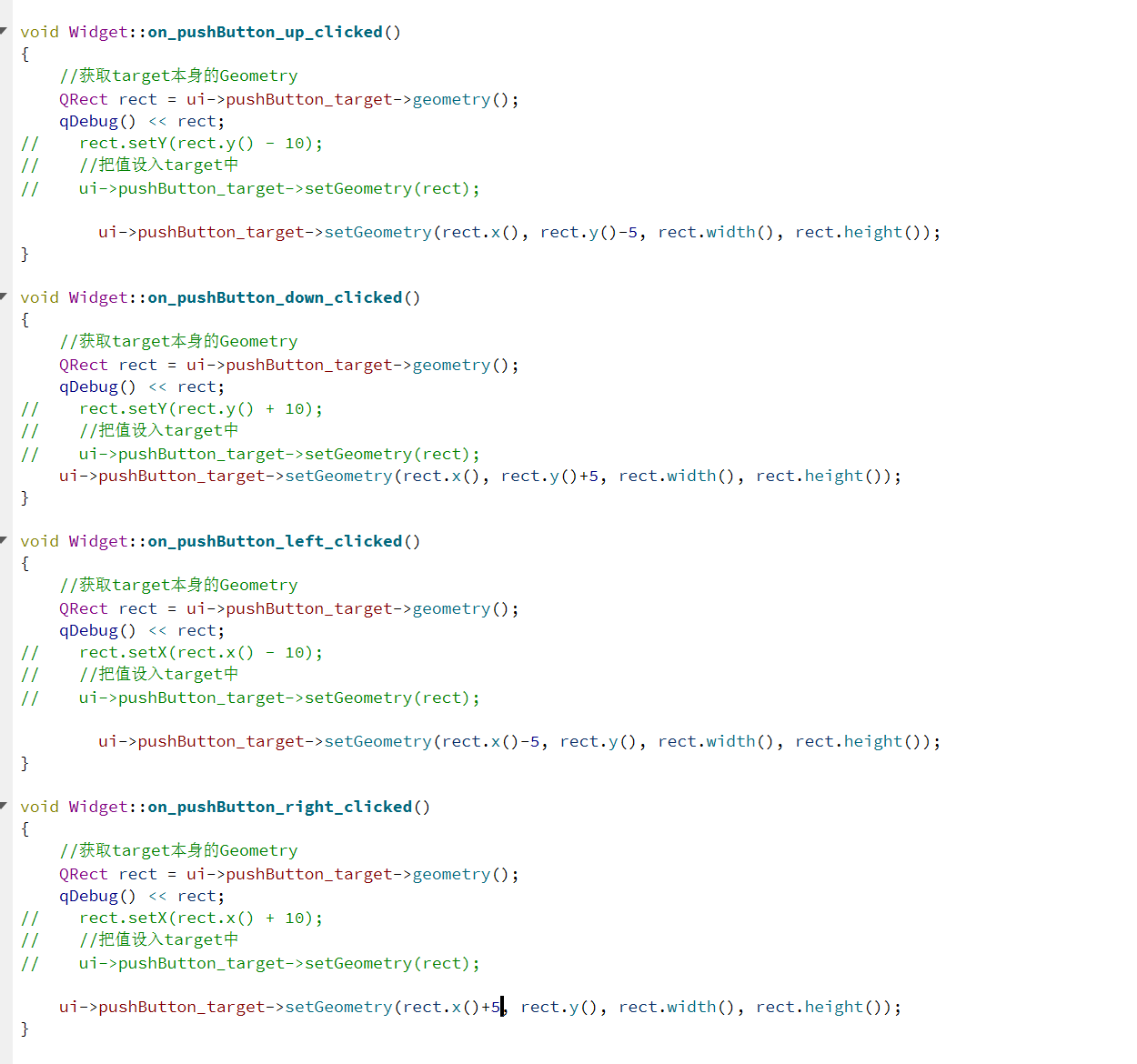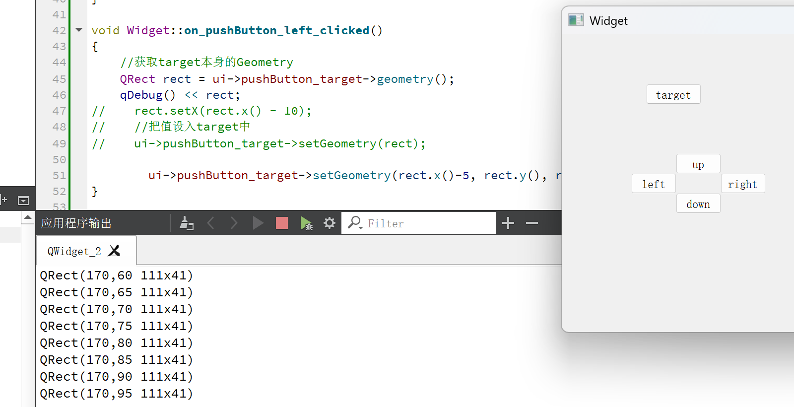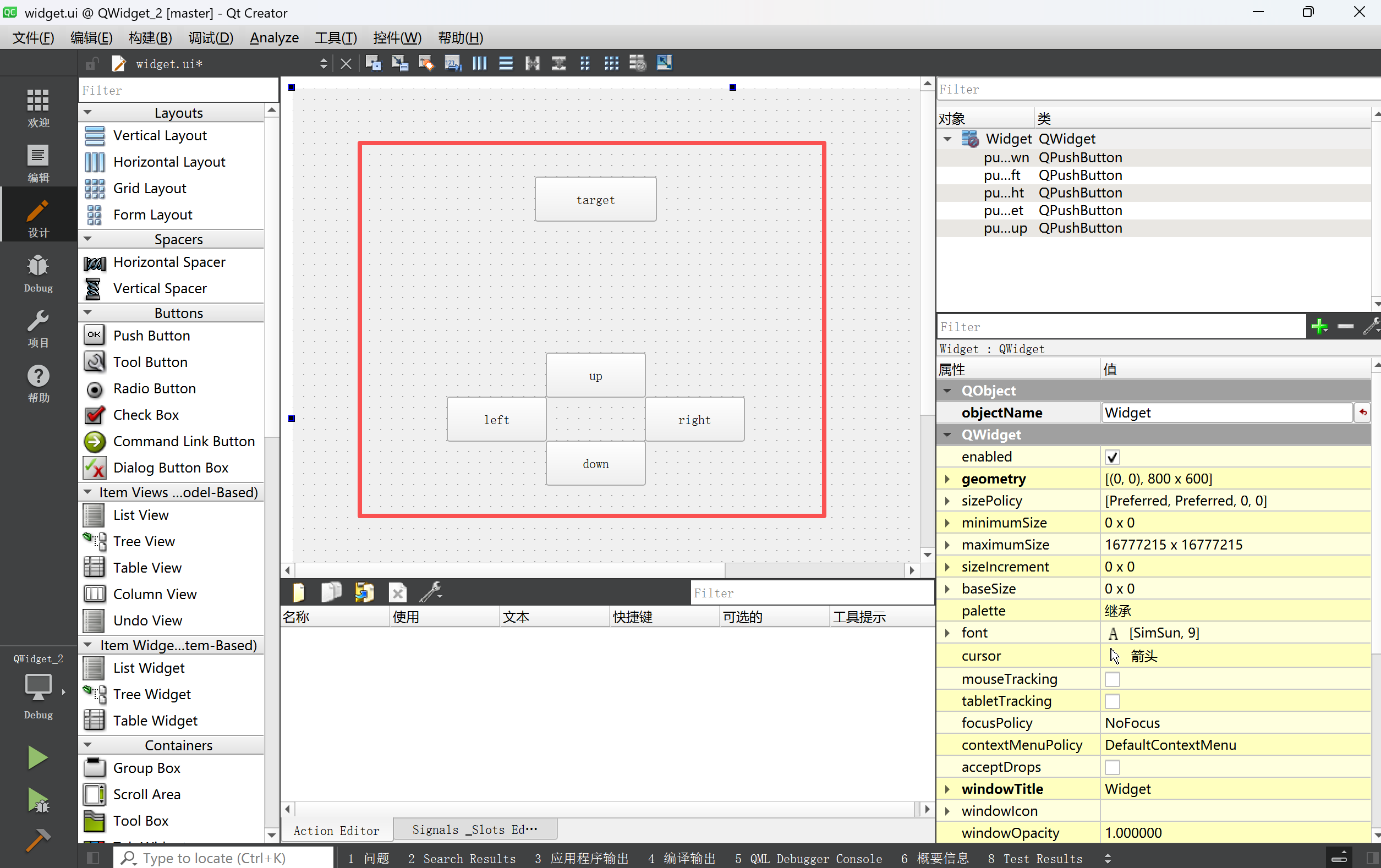 如上设置出五个按钮,我们期望通过点击下面的四个按钮,就能够修改target按钮的geometry。