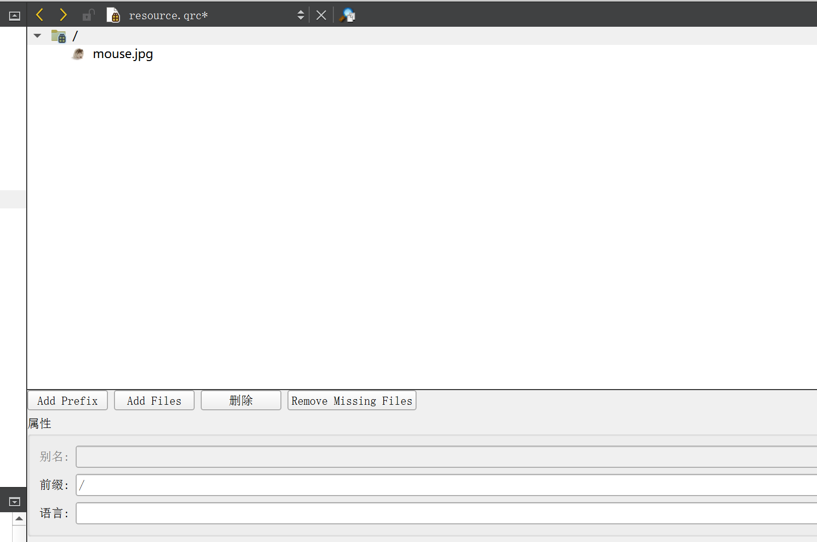 把刚刚使用的图片导入到资源文件中,上述的按钮在创建prefix之前是禁用的,创建好了之后就可以使用了,添加文件就是添加到prefix下面的。注意导入图片的时候,需要确保你导入的图片必须在resource.qrc文件的同级目录下,或者是同级目录中的子目录里。