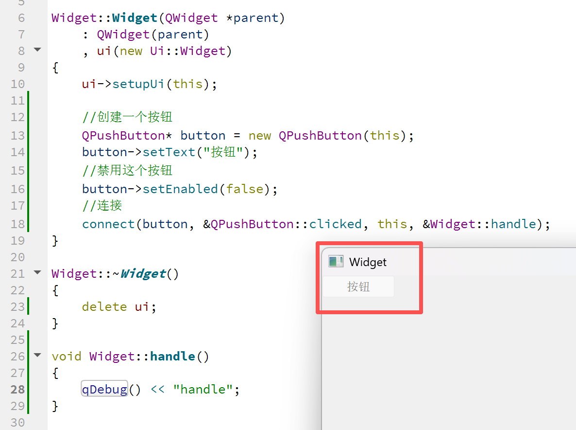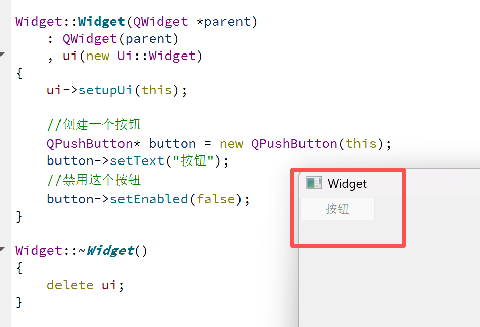 执行上述的代码,我们发现这个创建的按钮变成了灰色,这就是被禁用了。有的人就提出了问题:是不是没连接槽函数导致这个按钮执行不了呢?