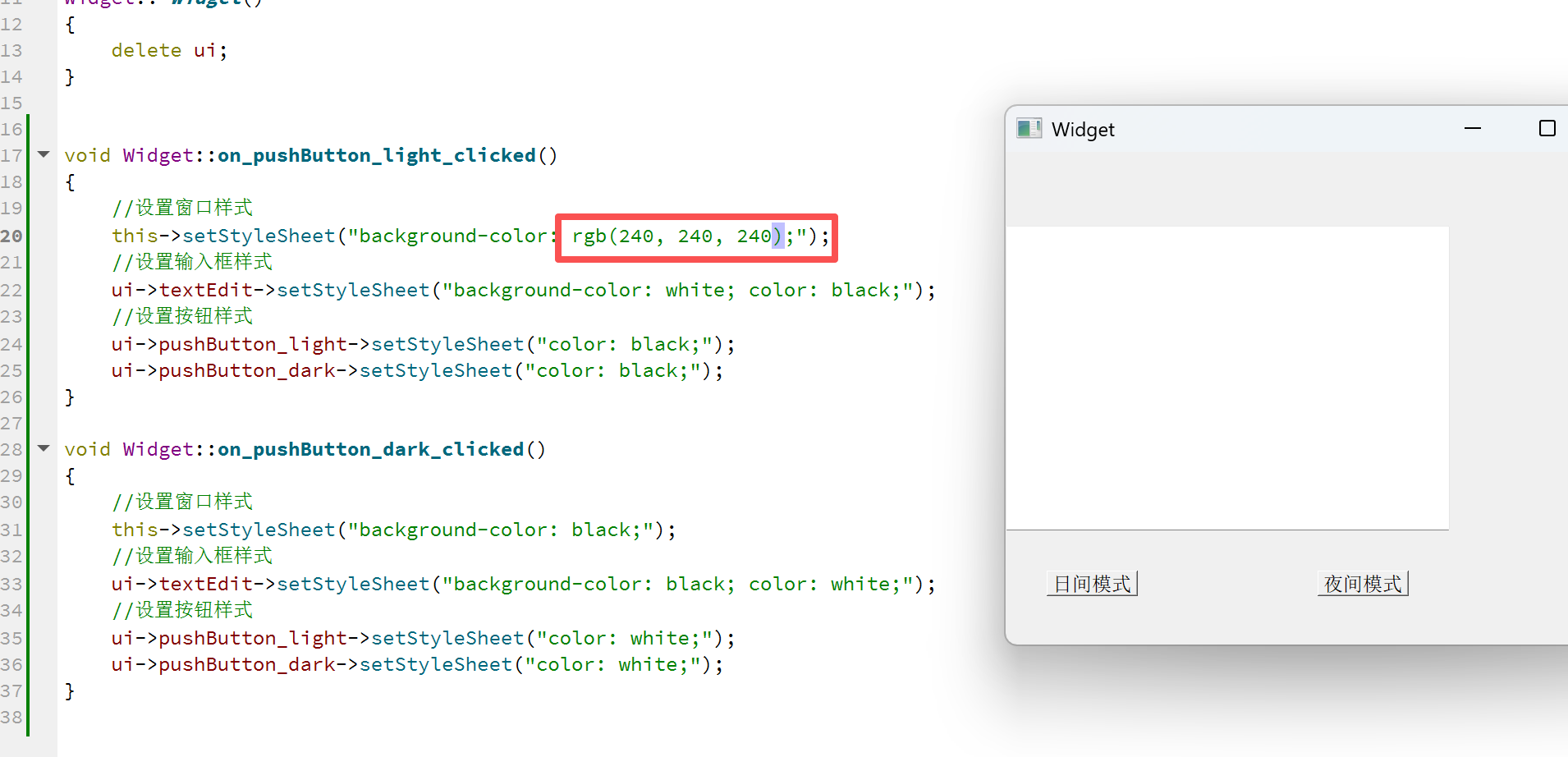 我们设置样式,这里注意,和CSS类似,QSS设置样式也是键值对的格式。键和值之间使用:分隔,键值对和键值对之间使用;分隔