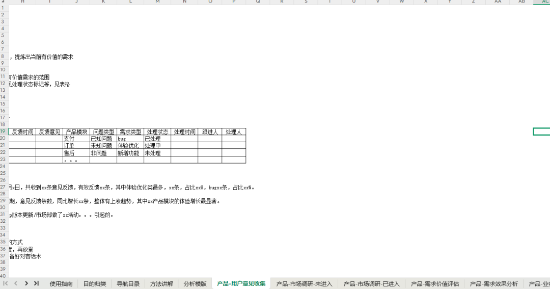 工具落地:- 定量数据:用产品后台(如APP的友盟+、GrowingIO,小程序的微信公众平台)直接导出指标,用Excel数据透视表快速汇总"不同用户群体(新/老用户)的功能使用情况"; - 定性数据:用腾讯问卷、麦客表单收集反馈,用飞书多维表格整理访谈记录,标注高频问题关键词(如"复杂""无用""卡顿")。