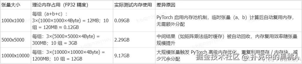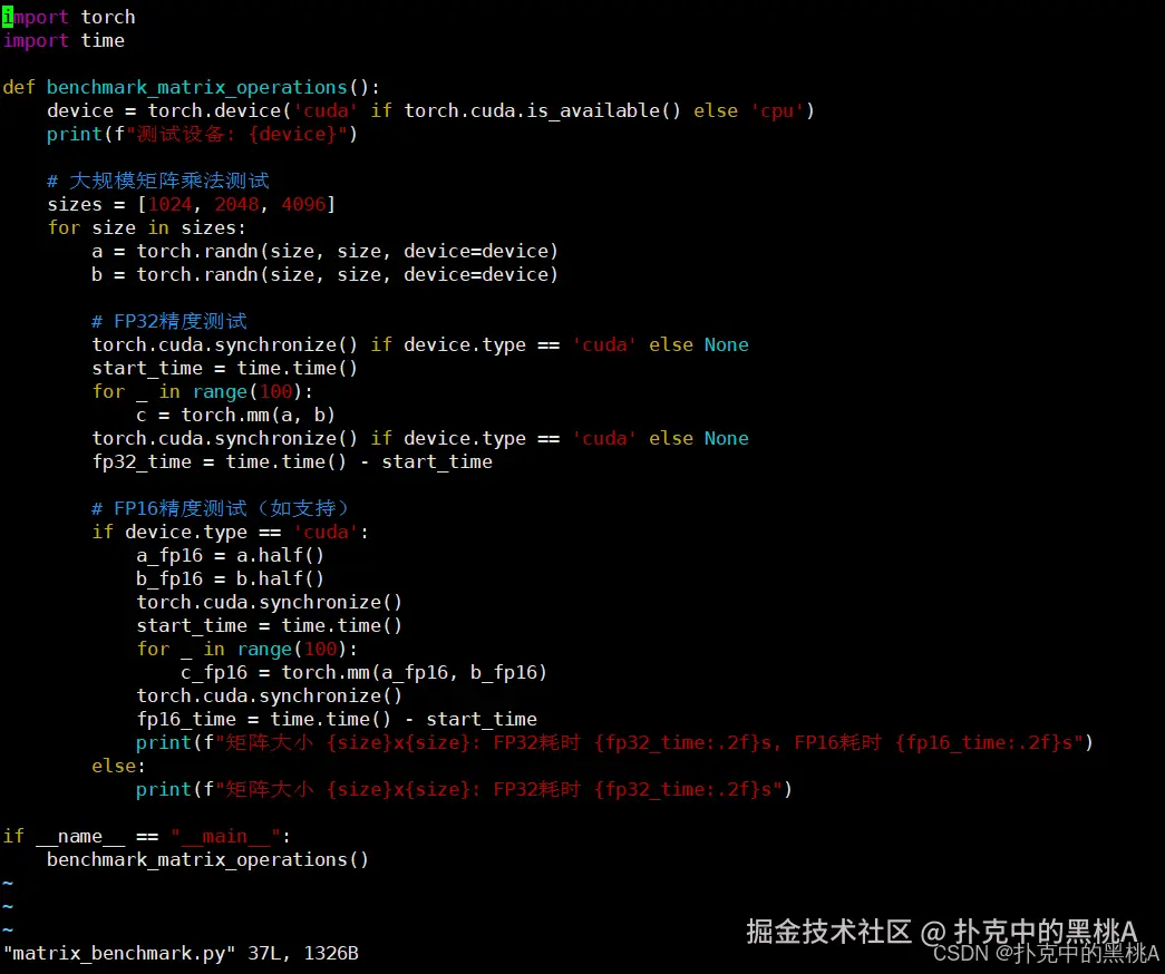 矩阵运算是深度学习的基础操作,我们使用PyTorch进行FP32和FP16精度下的性能对比: