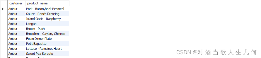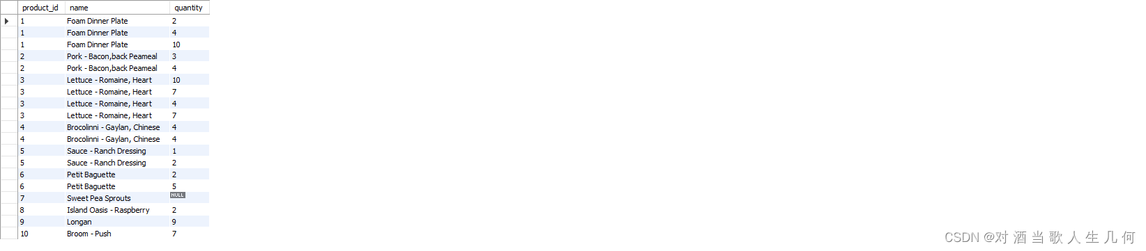 -- 每笔订单都返回产品id和名字,连同order items表的数量和单价