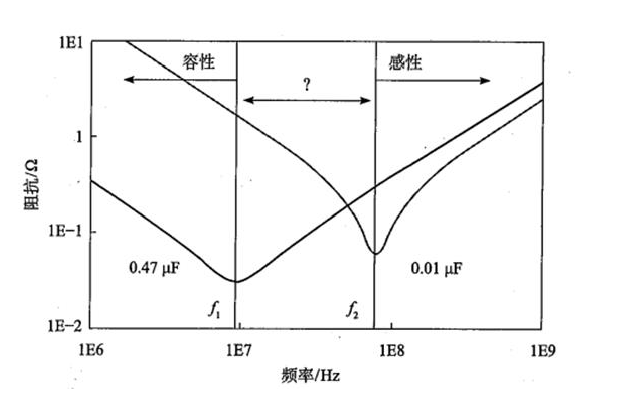 电容的阻抗-频率曲线:低频呈容性,高频呈感性,谐振点阻抗最低