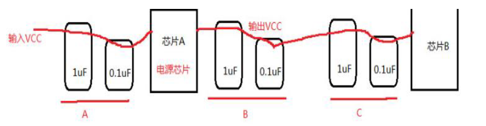 - 在电源输入端,通常会放置一个大容量电容,再靠近芯片放置一个小容量电容。