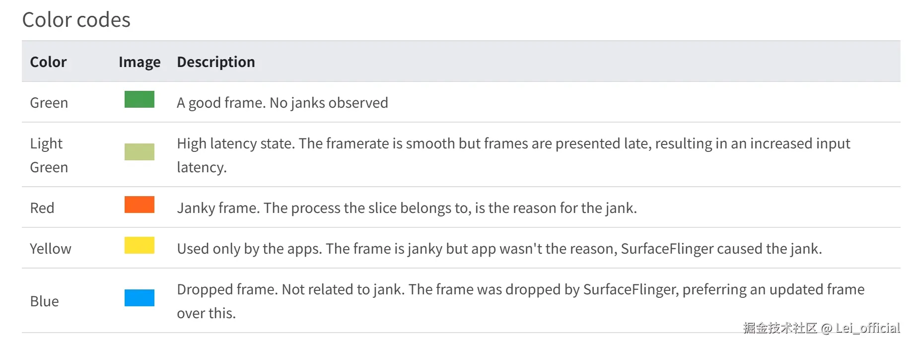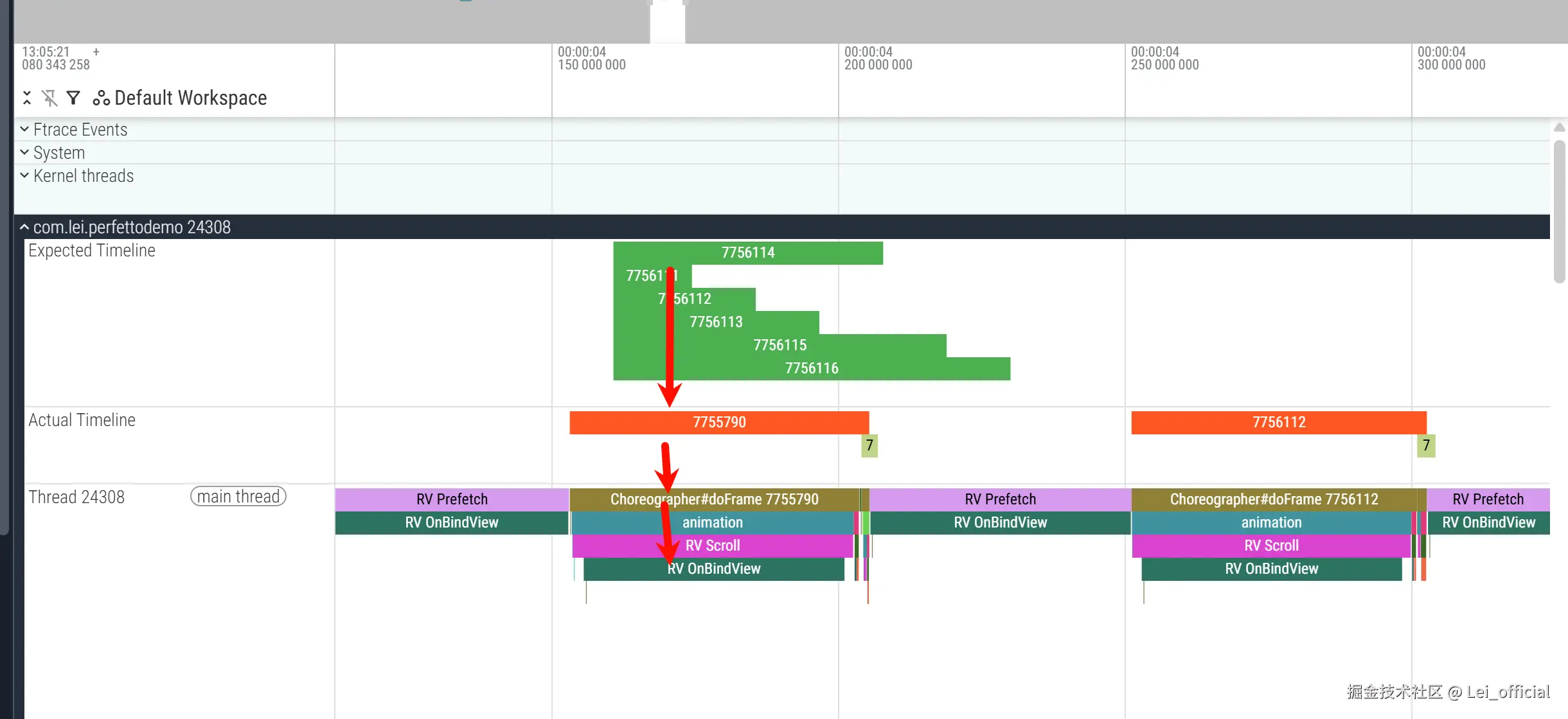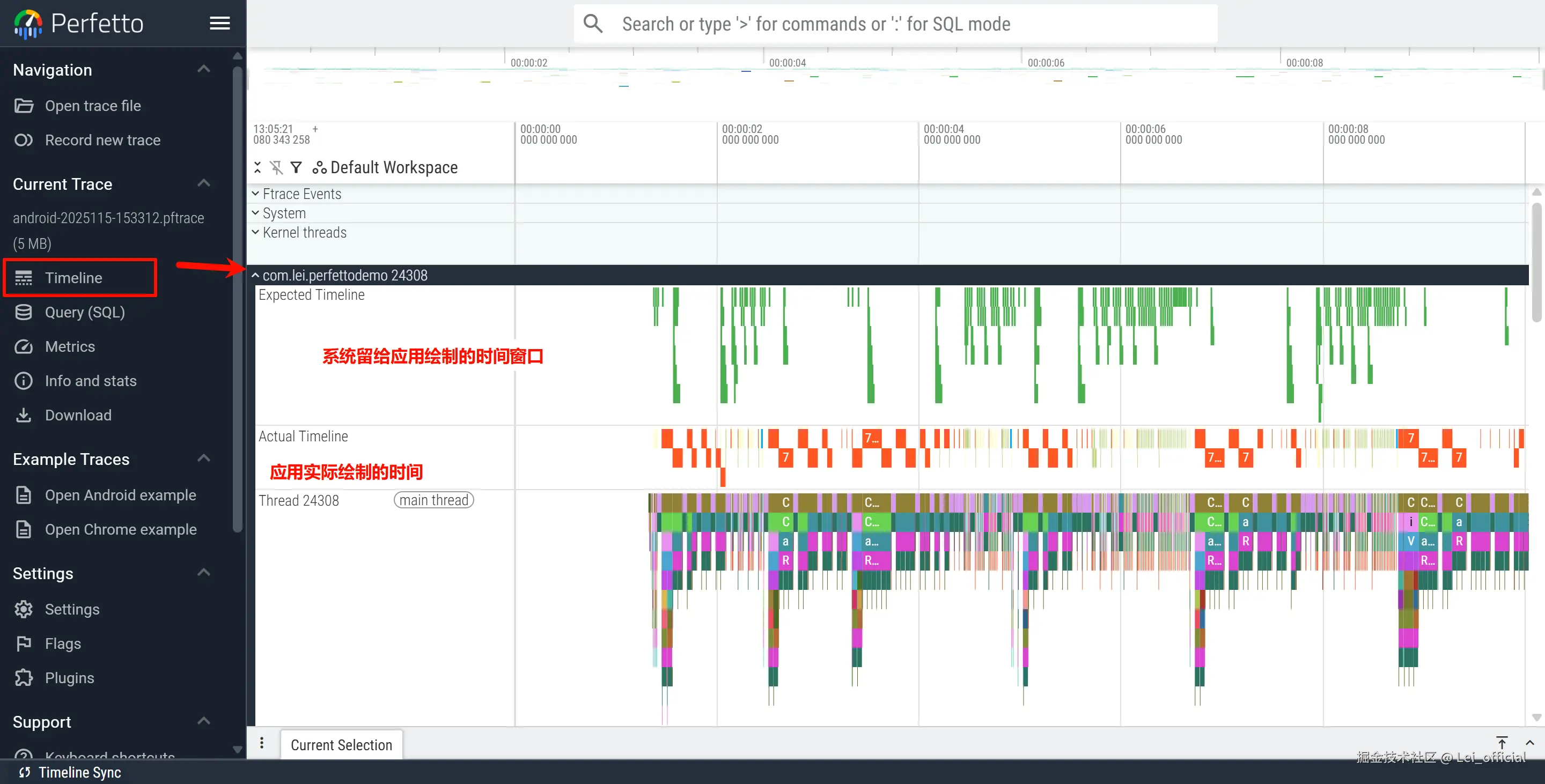 Expected Timeline:系统留给APP的绘制窗口,在60fps的情况下,一帧应当在16ms内完成绘制。Actual Timeline,APP实际绘制所消耗的时间,绿色表示符合系统窗口时间,红色则表示超过了系统时间,发生卡顿(UI Jank)。