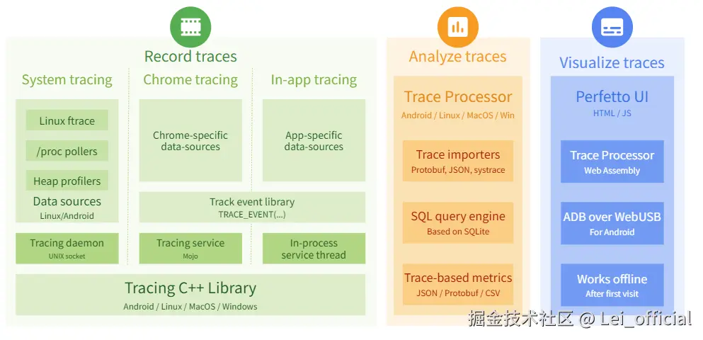 这是Perfetto官方的功能模块架构示意图,可以看到,围绕着 Traces,它的主要功能分为三个部分。