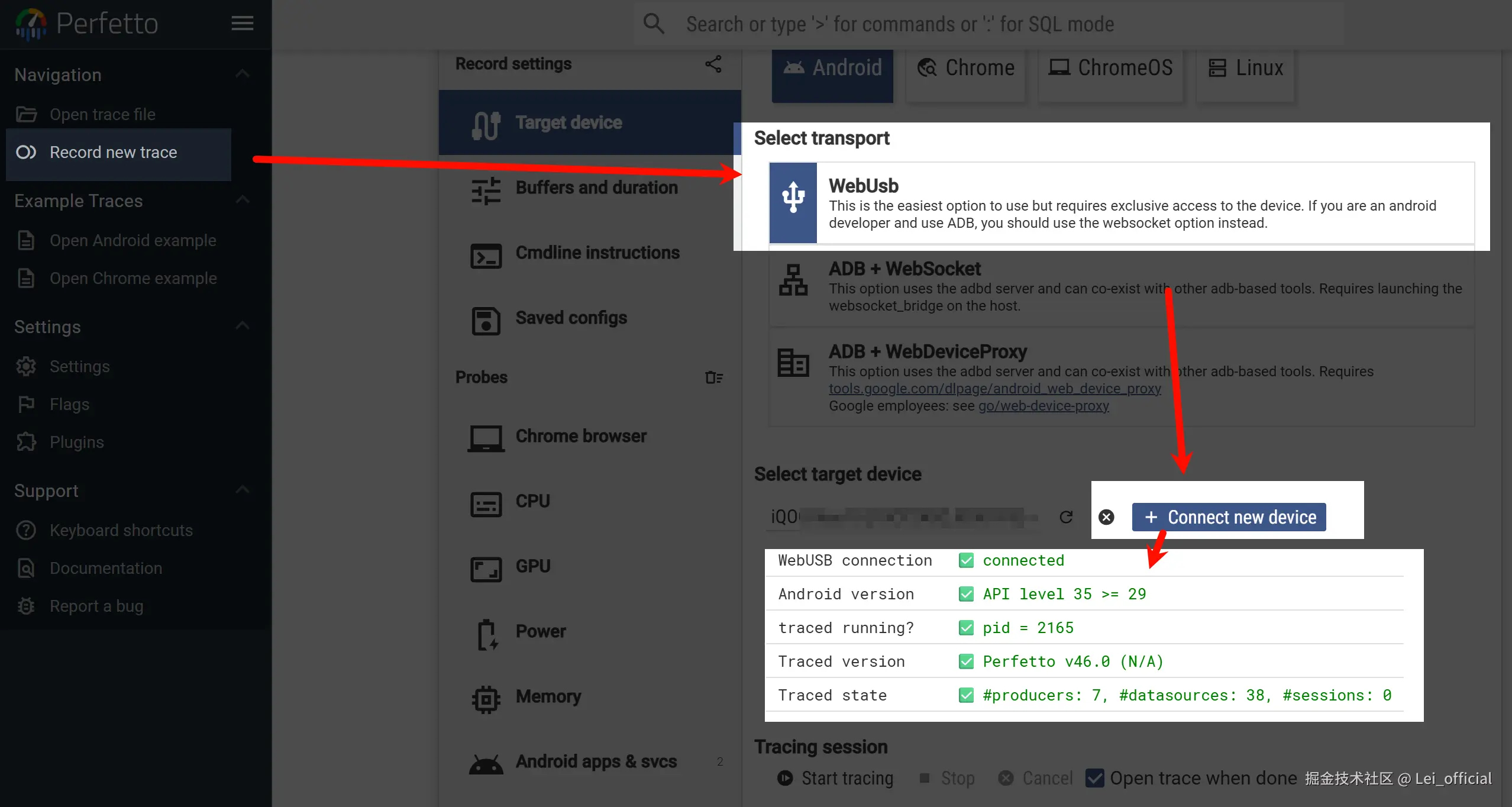 用USB连接手机至PC,在浏览器中打开 ui.perfetto.dev/ ,页面左侧选择"Record new trace",随后就可以在当前页面与测试手机建立连接,如下图。