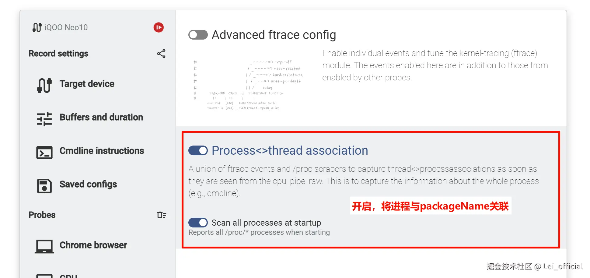 注意在最后一个选项目录"Advanced settings"中开启包名关联,如果不开的话,Tracing中就只有ProcessID,看不出来是哪一个具体进程。