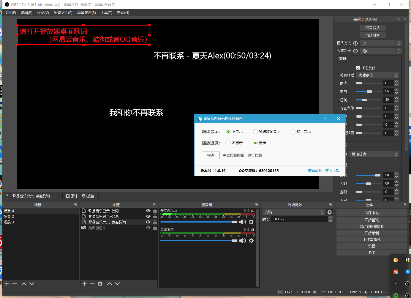 桌面歌词: 支持将上述播放器的桌面歌词直接捕获并显示在直播画面中。
