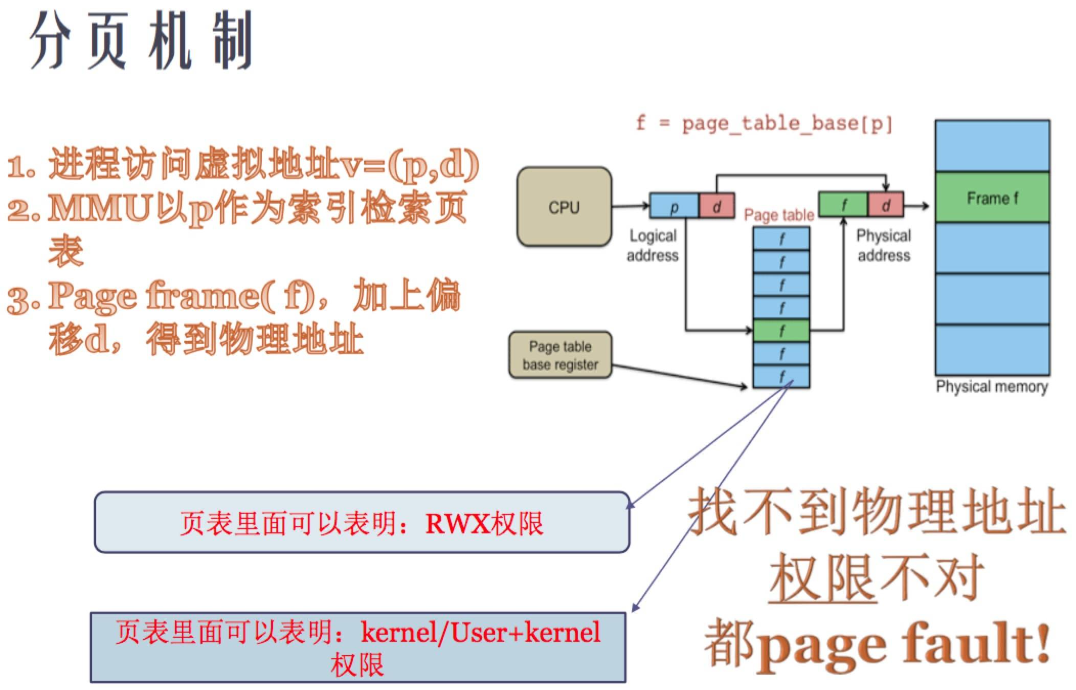 权限控制完全由 MMU + CPU 模式协同实现。每个MMU中的页表项,除了有虚拟地址到物理地址的映射之外,还可以标注这个页的 RWX权限 和 kernel和user模式权限(用户空间,内核空间读取地址的权限),它们是内存管理两个的非常重要的权限。