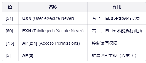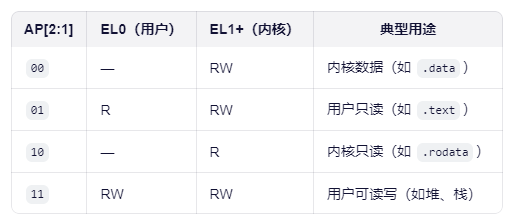 PTE_USER→ 设置 AP[2:1] = 11(EL0 RW, EL1 RW)PTE_RDONLY→ 设置 AP[2:1] = 01(EL0 R, EL1 RW)PTE_UXN_CLEAR→ UXN=0(允许用户执行)