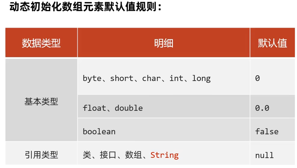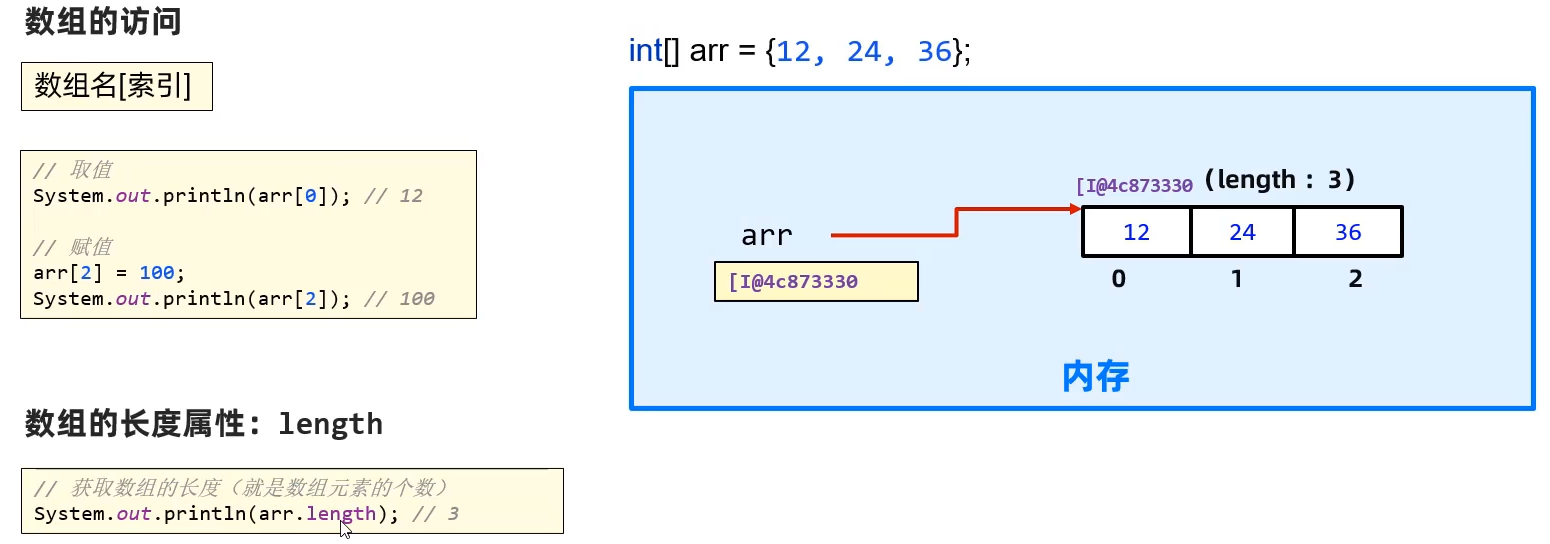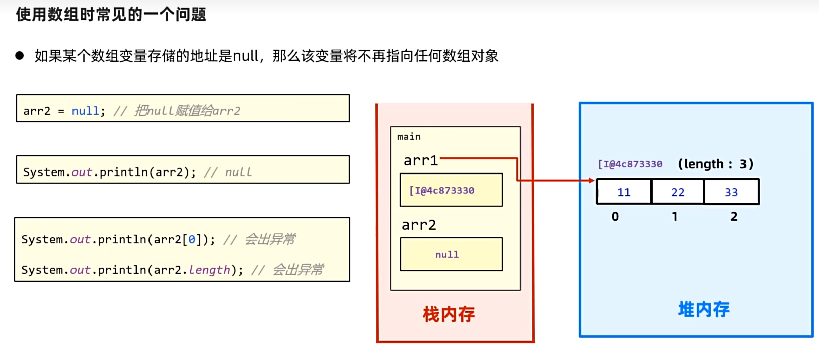 3.当数据变量存储的是null时,此时没有指向某个数组对象,因此访问和修改会报空指针异常。