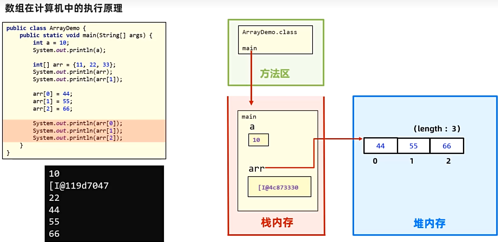 ArrayDemo.class文件先加载到方法区,其中的main方法运行时进入栈内存,存储a和arr变量,但是由于arr是被赋值为new出来的数组,因此需要先将数组存储到堆内存中,并且将其在堆内存中的地址传递给arr变量,因此arr变量中存储的是数组在堆内存中的地址。此时即使改变arr变量中数组的元素,其地址不变。