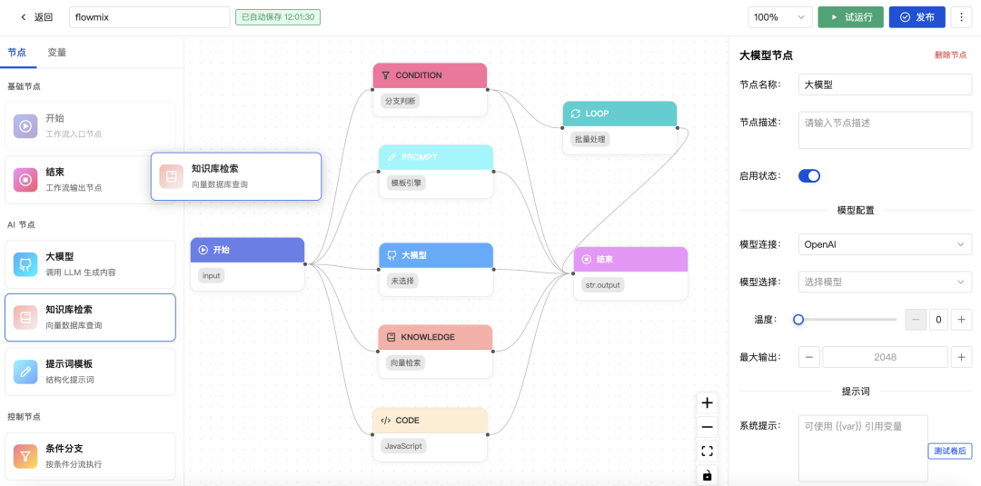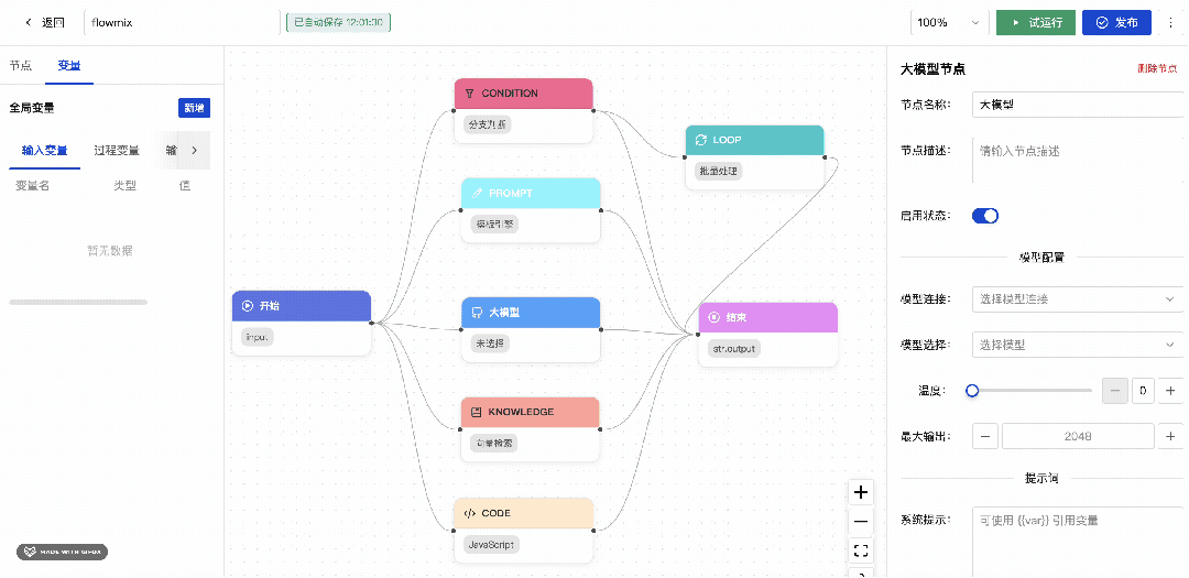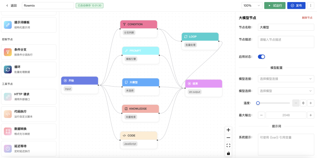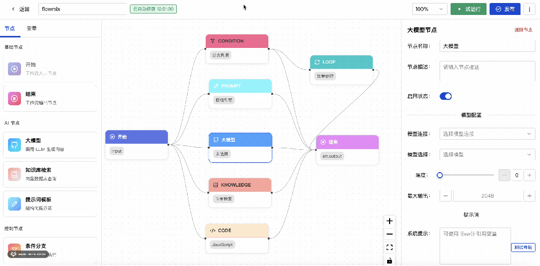 整个设计器实现了从节点定义,到节点拖拽,到节点的属性配置的全流程,大家可以基于这套方案开发公司内部的AI工作流产品。