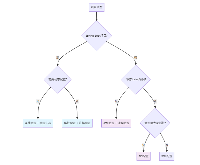 | XML配置 | 传统项目、复杂配置 | 功能全面、结构清晰 | 配置繁琐、不够简洁 |