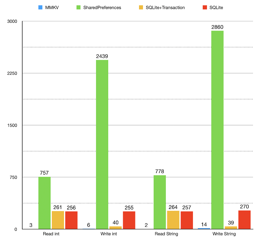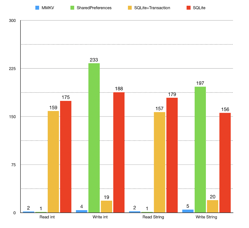 下面是MMKV官方给出的数据对比图,将MMKV和SharedPreferences、SQLite进行对比,重复读写操作1k次。