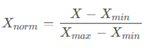 这个公式将原始数据 X 从其原始范围转换到 [0,1] 的范围内。 公式各部分解释