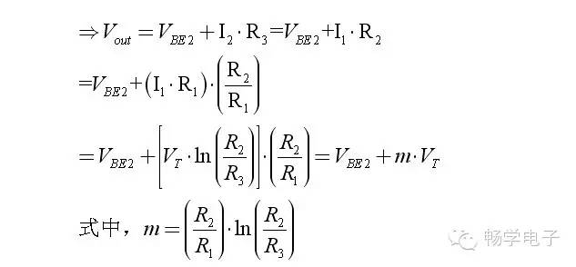 这里m是热电压VT的加权系数。别忘了一个事实:VBE的温度系数约为-2mV/OC<0,而VT的温度系数则约为+0.0865mV/OC>0。所以只要适当地设定m的值就可以使得Vout的温度系数在很宽的温度范围内接近于0!这就是带隙型稳压电路的核心思想所在。