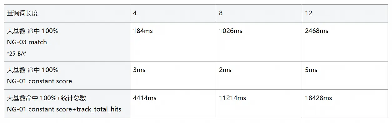 1)功能受限: 搜不到单字的短词, 且严禁开启总数统计(否则耗时飙升 1000 倍至 4.4s,见附录 6. 3);
