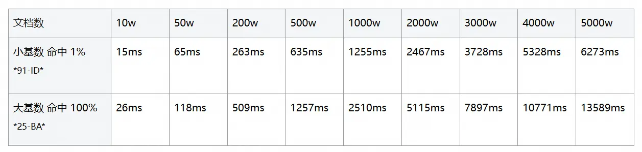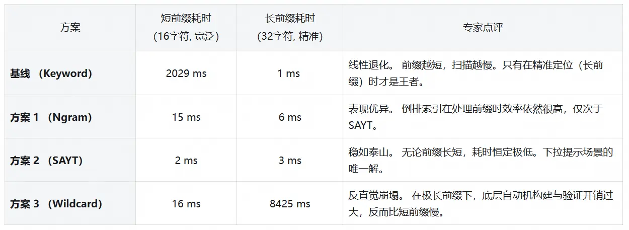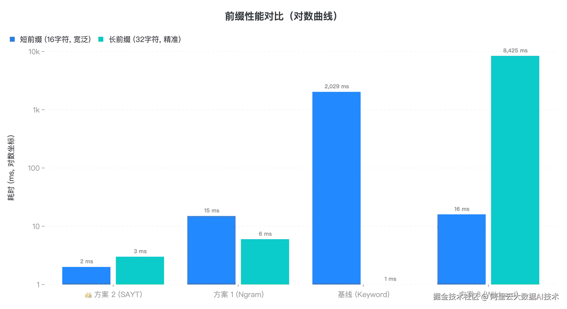 在测试中,我们分别对比了各方案在 宽泛前缀 (匹配大量文档)和 精准前缀(匹配少量文档)两种场景下的表现。