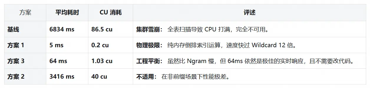 评价: 唯一推荐的通用解。它是最安全的默认选项。它也许在某些特定 case(如超短前缀)下不如 Ngram 暴力,但它能处理所有情况(包括正则、复杂通配)。查得准、用得爽(零侵入)、存得省。