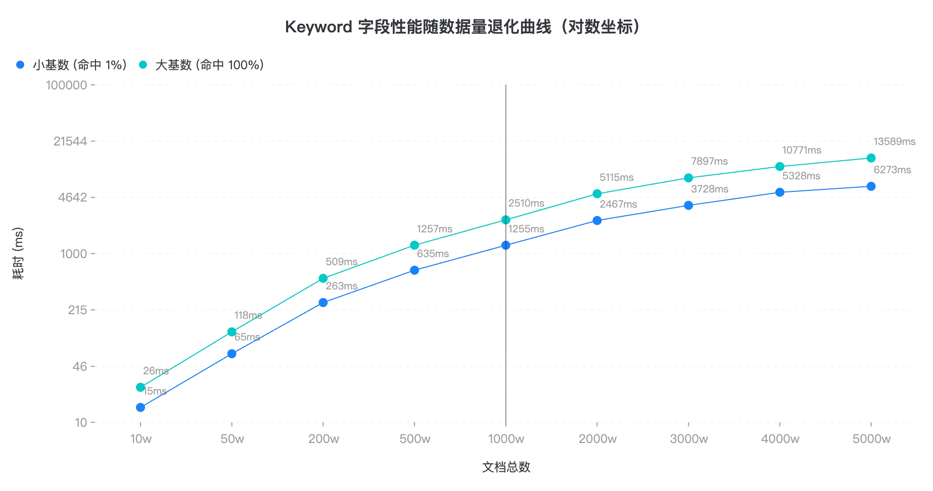 为了让大家直观感受都 keyword 的表现,我们测试了不同数据量下的查询耗时。可见,超过 1000w,即使是小基数,也要 1s+,业务已无法使用。