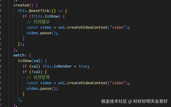 通过id创建VideoContext对象,利用.pause()方法暂停,.play()方法播放。