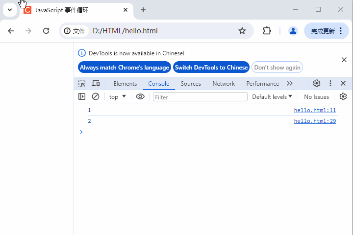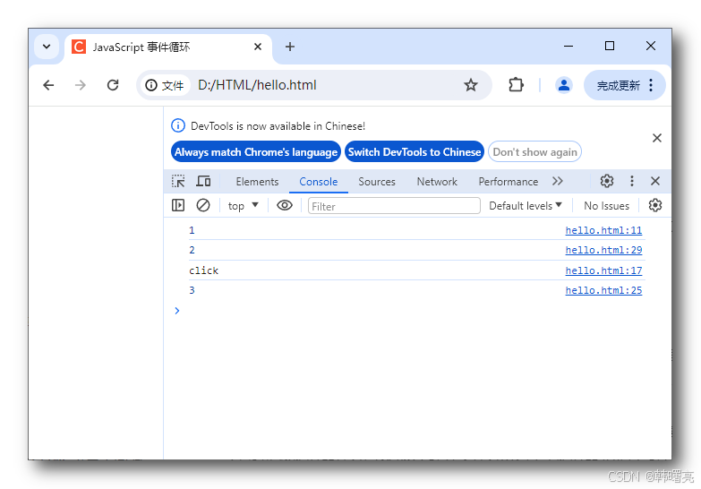 进入界面后 , 马上打印出 1 和 2 , 在 3 秒定时器 没有到期前 , 鼠标点击文档页面 , 此时会打印出 click , 3 秒定时器到期后 , 会打印出 3 ;
