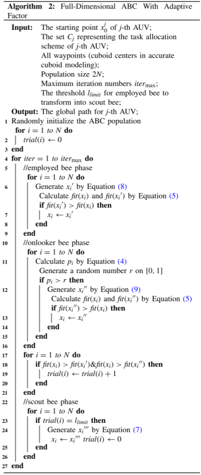 本文针对水下物联网(IoUT)中环境未知、搜索困难等关键问题,提出了一种基于多算法融合的水下全覆盖搜索方法,方案综合运用了改进的 Voronoi 聚类策略、全维度自适应人工蜂群(ABC)算法、改进的视线(LOS)路径平滑技术以及人工势场(APF)动态避障方法,实现了对未知水下区域的高效移动目标搜索。Voronoi 聚类用于区域划分与任务分配;ABC 算法负责生成全局搜索路径,并通过改进 LOS 技术进行优化;在航行过程中,AUV 可依据 APF 方法实现局部避障与动态路径调整。