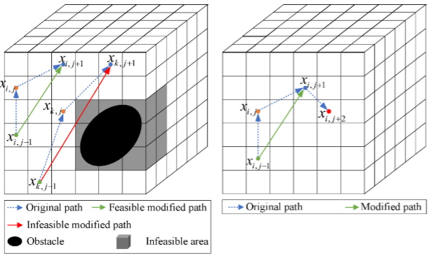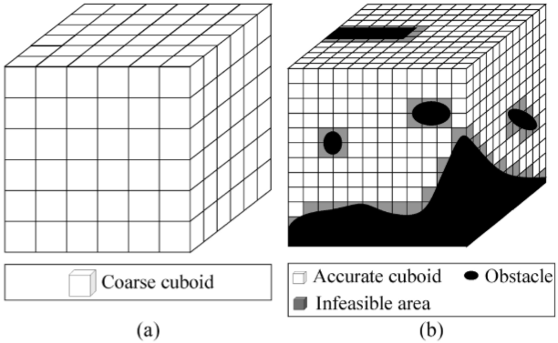 任务区域被划分为可行与不可行区域,并采用两类立方体模型:粗立方体建模(用于任务分配),基于 AUV 探测范围,将区域划分为边长为 S L c = 2 R d SL_{c}=\sqrt{2}R_{d} SLc=2 Rd的粗立方体,每个粗立方体中心视为一个任务点。精细立方体建模(用于路径规划),在粗立方体基础上进一步细分,边长设为 S L a = ( 1 / q ) S L c SL_a=(1/q)SL_c SLa=(1/q)SLc,以=生成更多 waypoint 便于避障。通过对不确定障碍物添加安全边界(扩张轮廓)来提高局部避障的安全性,减少 AUV 与障碍物碰撞的风险。