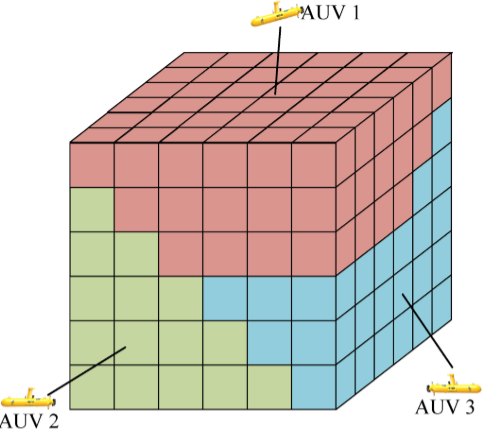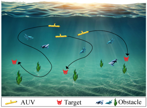 任务场景为一个矩形水下区域,内部存在若干未知目标,以及部分已知(地形、结构物)与未知(漂浮物、鱼群等)的混合障碍物。为提升搜索效率,系统需利用多台 AUV 对该区域执行全覆盖搜索,且出于安全考虑采用被动感知方式。任务区域为含有未知目标与混合障碍物的矩形水域。区域根据距离、负载与连贯性划分为 M M M个子区域,分别由 M M M台 AUV 负责搜索。每台 AUV 采用全局路径规划提升覆盖率,结合局部规划进行避障,以实现高效、安全的全覆盖搜索。
