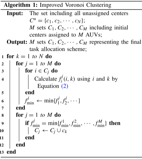 本节提出了改进Voronoi聚类策略用于多 AUV 任务分配。传统方法以最短到达时间为准则,容易导致子区域不连续、任务分配不均,从而产生冗余搜索并拉长任务时间。为解决这些问题,研究将目标函数改为基于中心点之间的距离并加入任务负载项,使区域划分既保持空间连续性,又能维持 AUV 之间的任务均衡。先为每台 AUV 分配最近的中心作为起点,再根据改进的目标函数逐步分配剩余中心点。