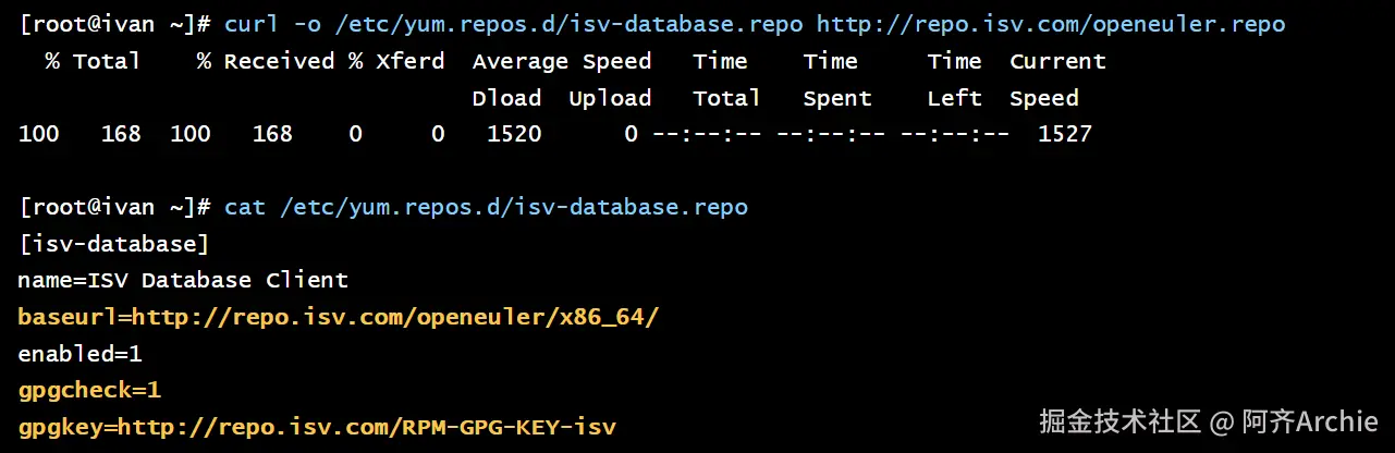 # 示例:从 ISV 厂商处下载并安装 repo 文件curl -o /etc/yum.repos.d/isv-database.repo http://repo.isv.com/openeuler.repo