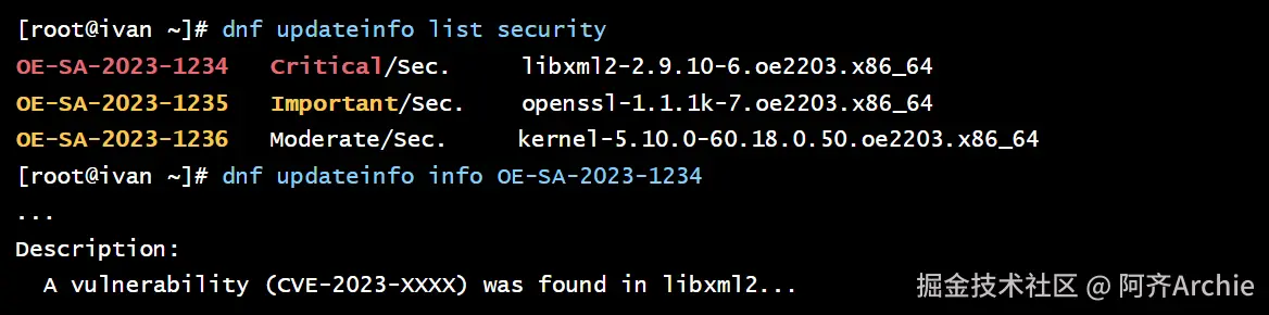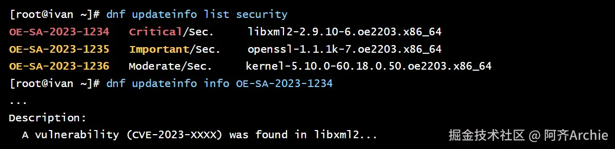 对于生产系统,全量更新可能带来风险。DNF 支持仅针对安全漏洞进行更新。