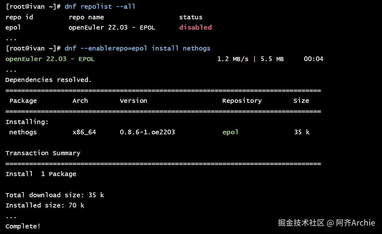 实战:启用 EPOL 并安装 nethogs 默认 EPOL 仓库可能是禁用的,需要手动启用。