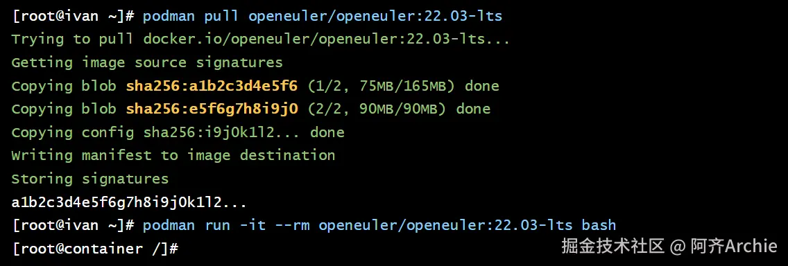 podman run -it --rm openeuler/openeuler:22.03-lts bash