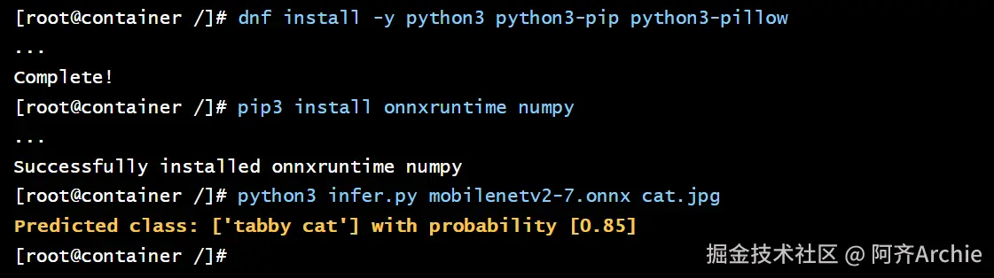 # 2. 准备模型和测试脚本 (此处省略下载 MobileNet ONNX 模型和编写推理脚本的步骤)# python3 infer.py mobilenetv2-7.onnx cat.jpg# 3. 执行推理