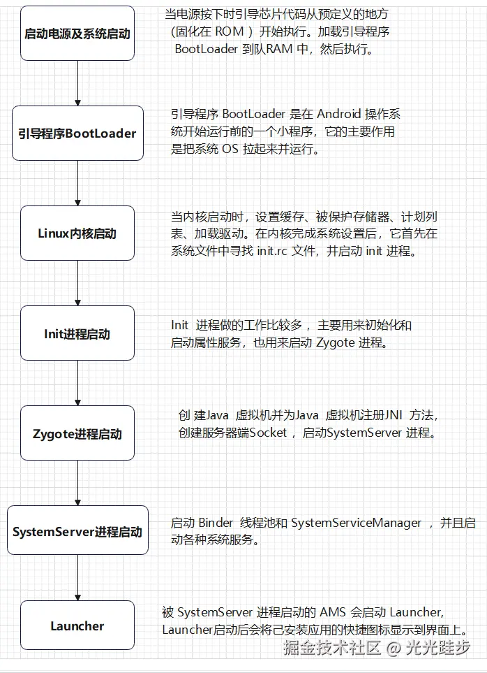 启动电源及系统启动 -> Bootloader -> Linux内核启动 -> Init -> Zygote -> SystemServer -> Launcher