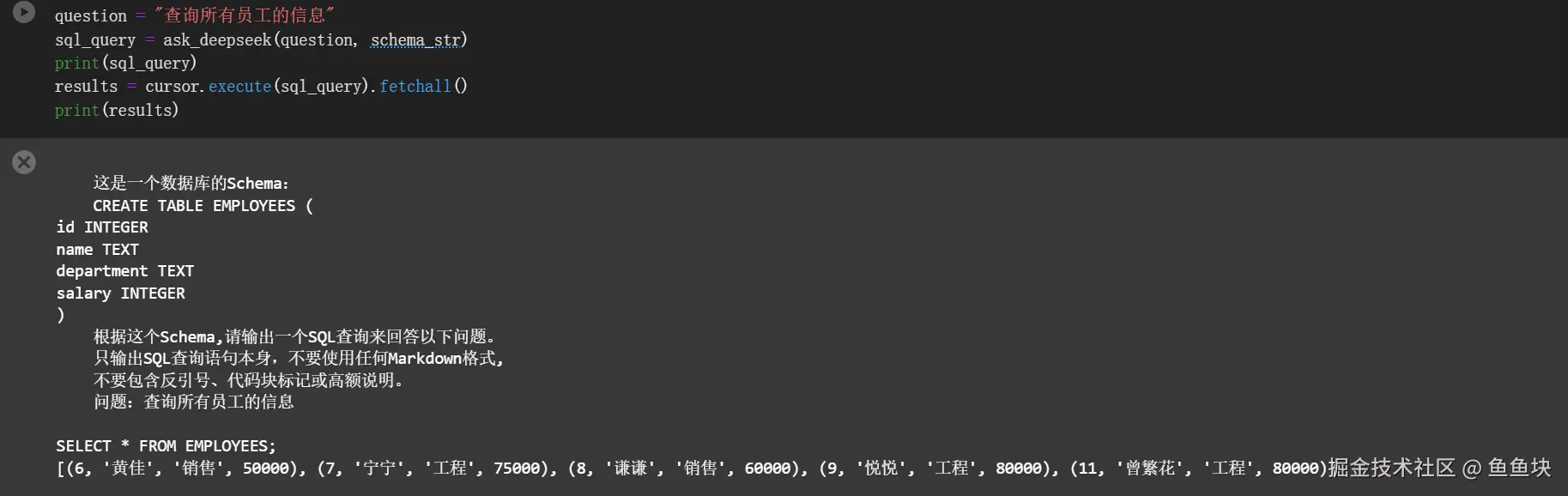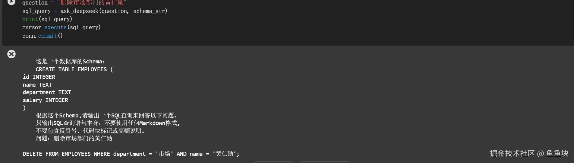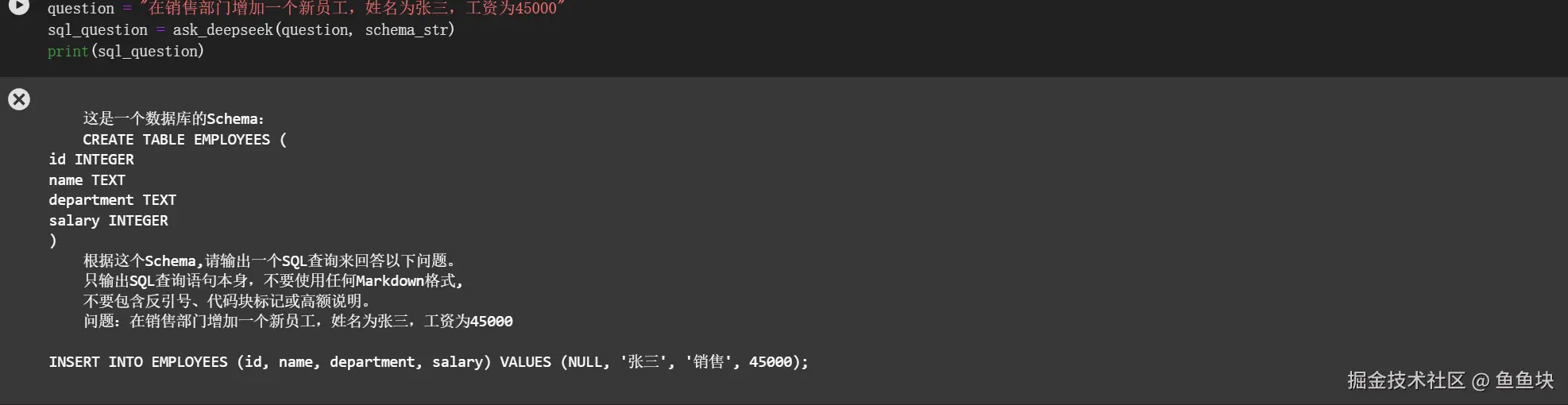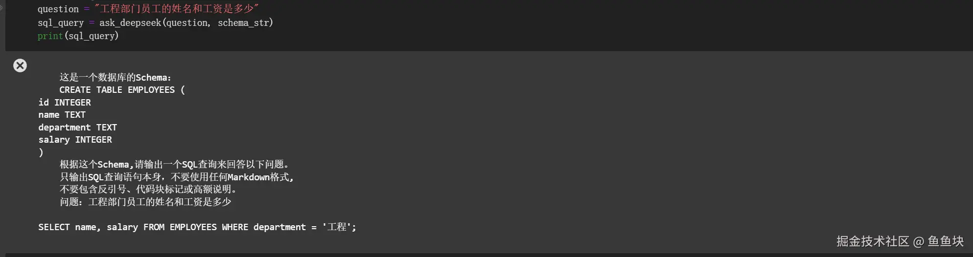 这里,大模型被严格要求 只输出 SQL,不输出解释、不输出格式化、不输出注释。这是在工程级应用中常见的 prompt pattern,通过"干净输出"确保 SQL 能直接执行。