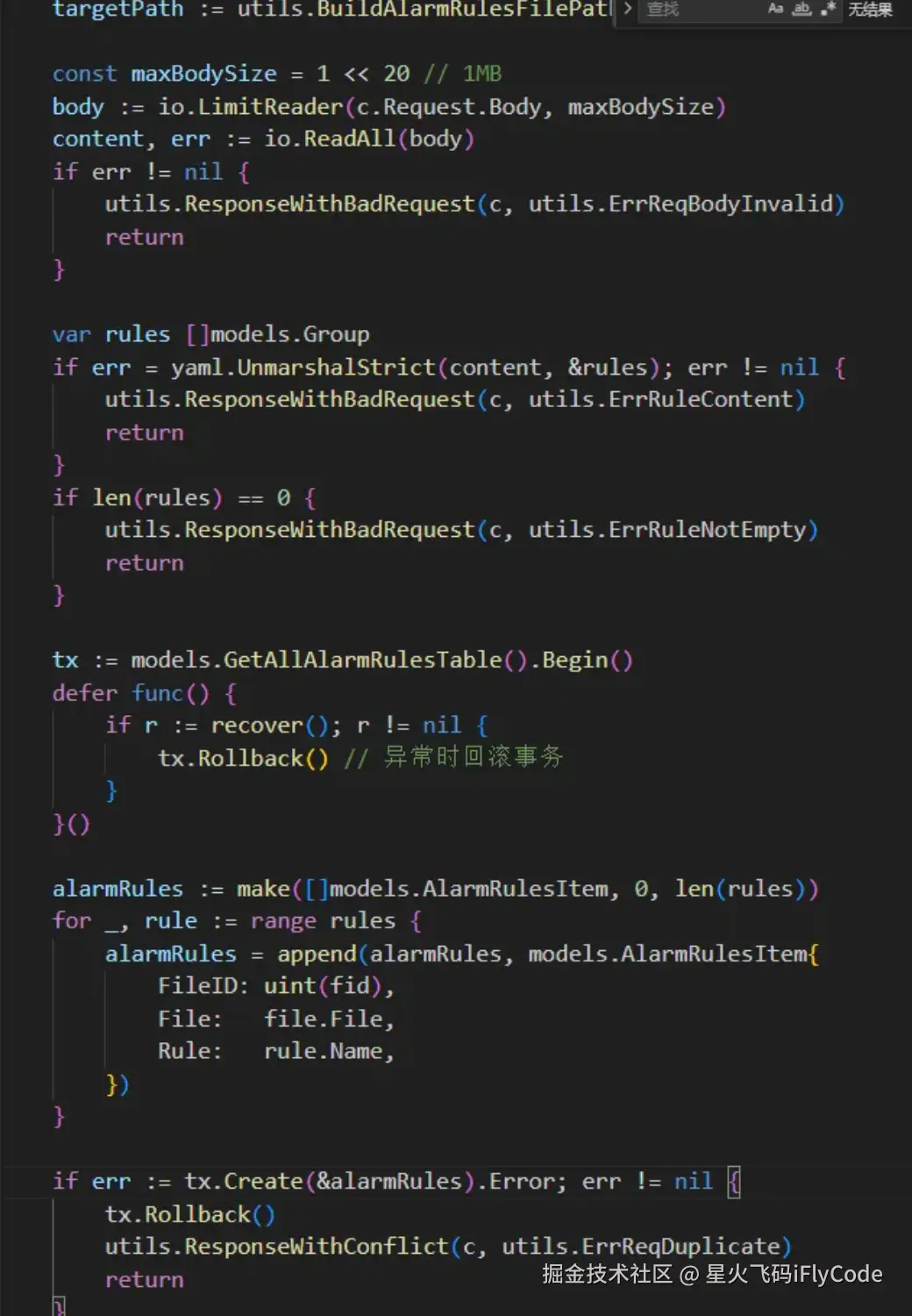添加的yaml文件解析前置步骤清晰,首先确认文件是否存在,然后限制文件大小进行读取以防崩溃,用严格模式解析yaml文件杜绝了格式问题。将所有数据库操作放在事务内实现,满足提示词要求,因此采用该结果,适配实际代码:通过智能对话方式实现代码补全的内容,采纳率达70%以上。