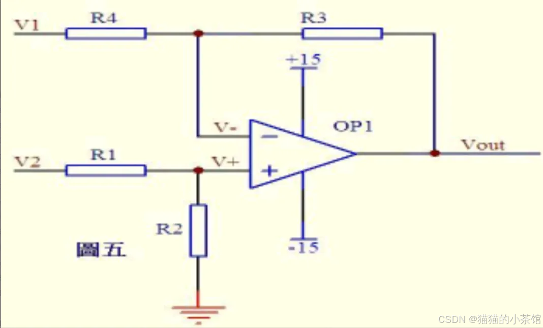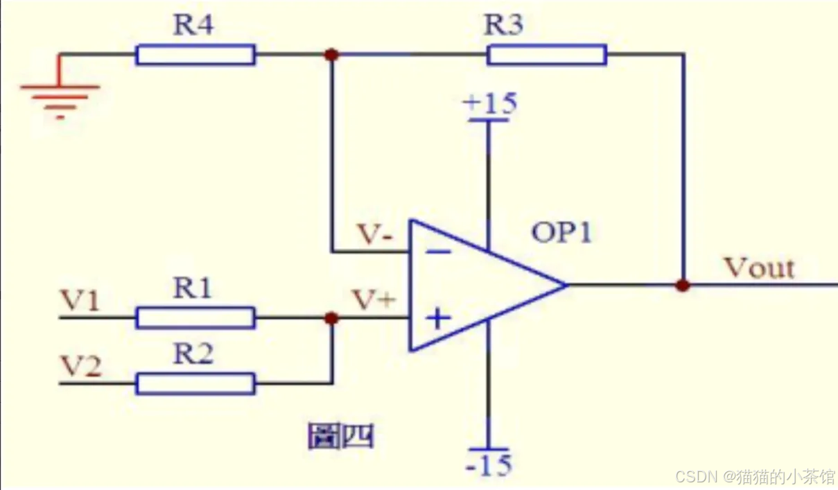 (V1-V-)/R4=(V-- Vout)/R3如果