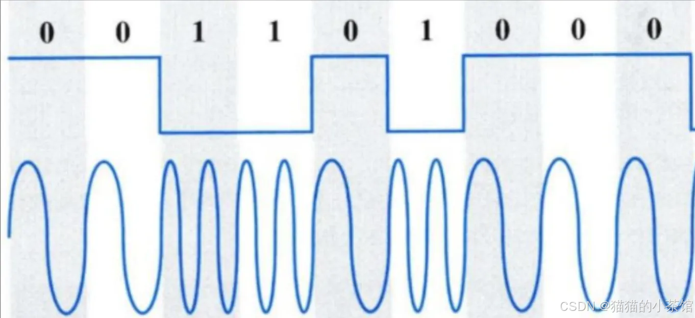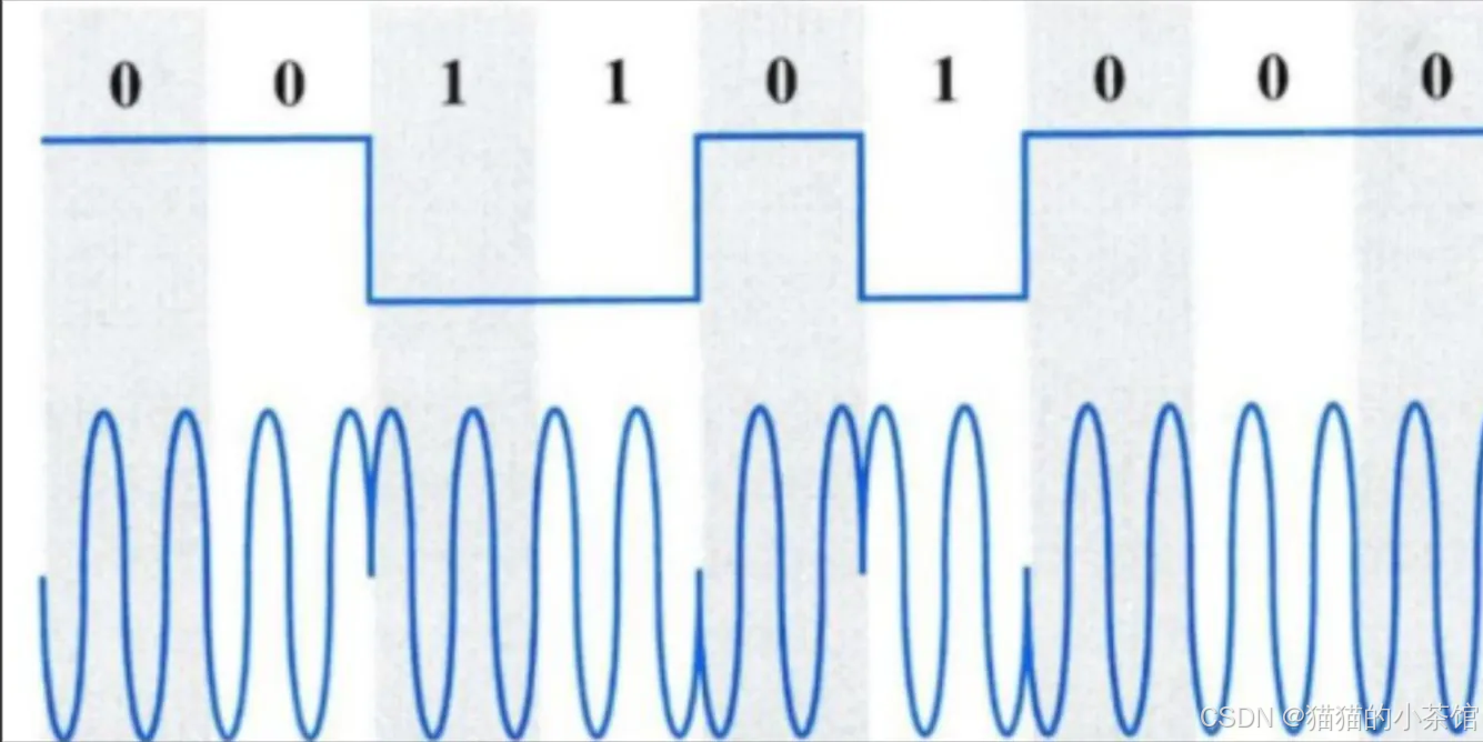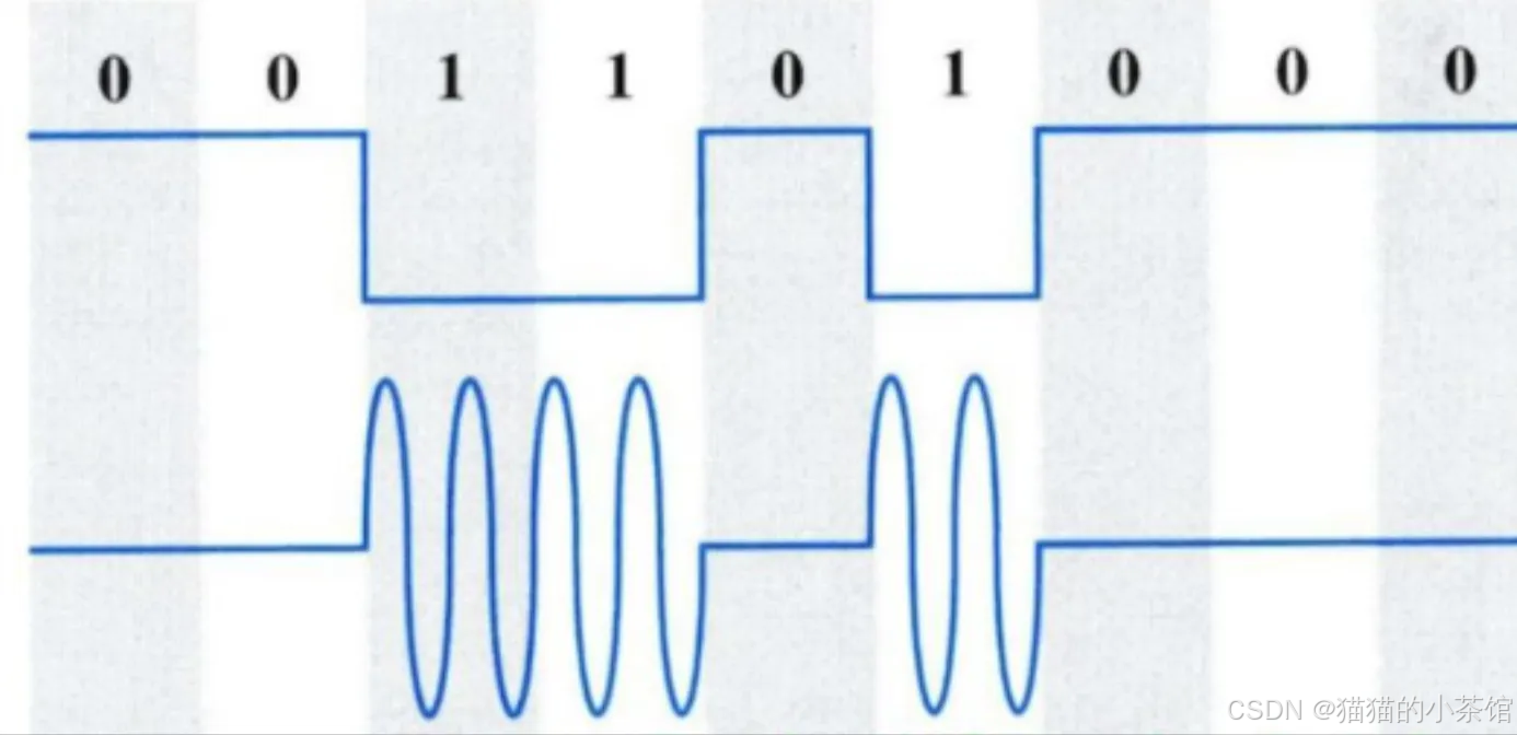 频率键控(FSK): 用二进制数据调制载波的频率,形成具有明显变化的频率来表示数据位