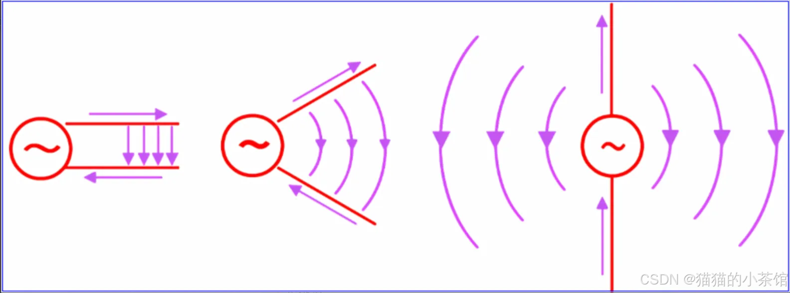 - 当这根张开的双轨线输入交流电,电场磁场交替感应,天线的能量就被传送出去了,所以发射设备将信号以特有的方式编辑(调制),通过天线发送出去