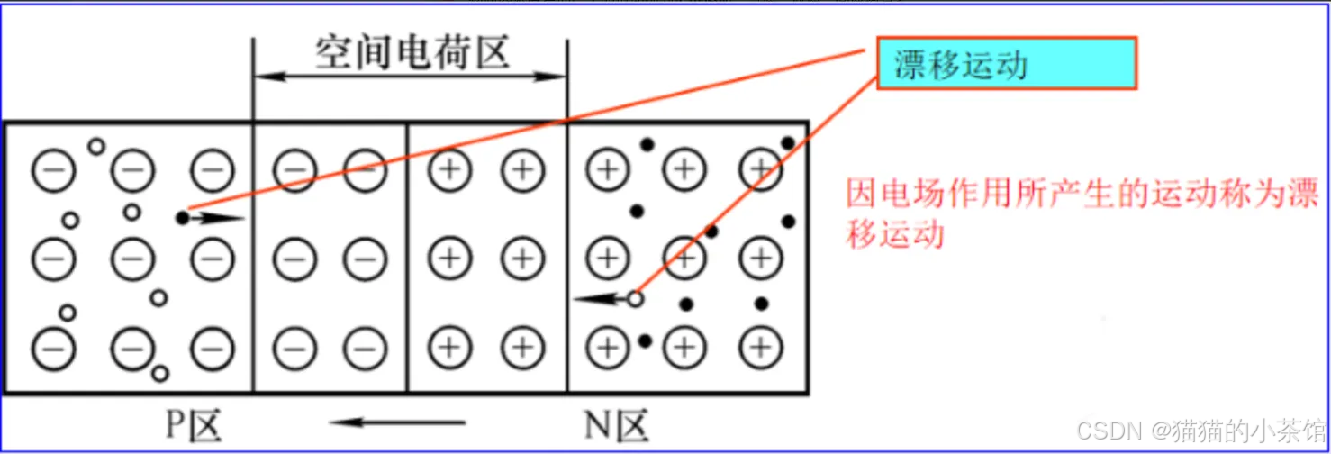 ● 由于扩散运动使P区与N区的交界面缺少多数载流子,形成内电场,从而阻止扩散运动的进行,内电场使空穴从N区向P区、自由电子从P区向N区运动叫做漂移运动