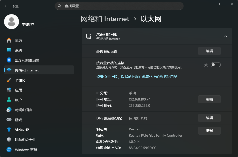 选择当前连接开发板的那个以太网适配器,点击「IP 分配」旁边的 编辑。