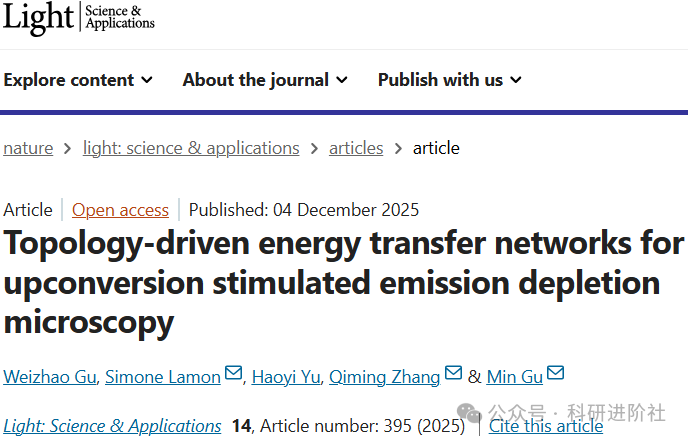 近日,国际光学顶尖期刊《Light: Science & Applications》发表了一项突破性研究(https://doi.org/10.1038/s41377-025-02054-y)。该研究由上海理工大学人工智能科学与技术学院与光子芯片研究院团队共同完成。研究提出了一种基于"拓扑驱动能量转移网络"的新方法,成功将上转换受激发射损耗显微镜的激发与耗尽激光强度大幅降低,实现了65纳米的高分辨率成像,为低功耗、长时程的活体超分辨成像提供了全新可能。